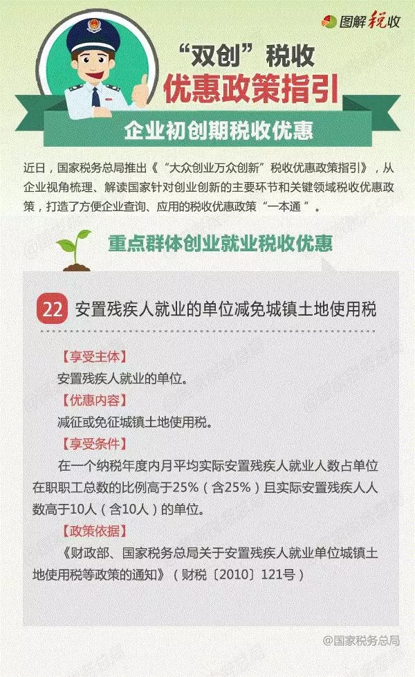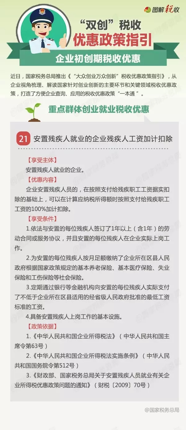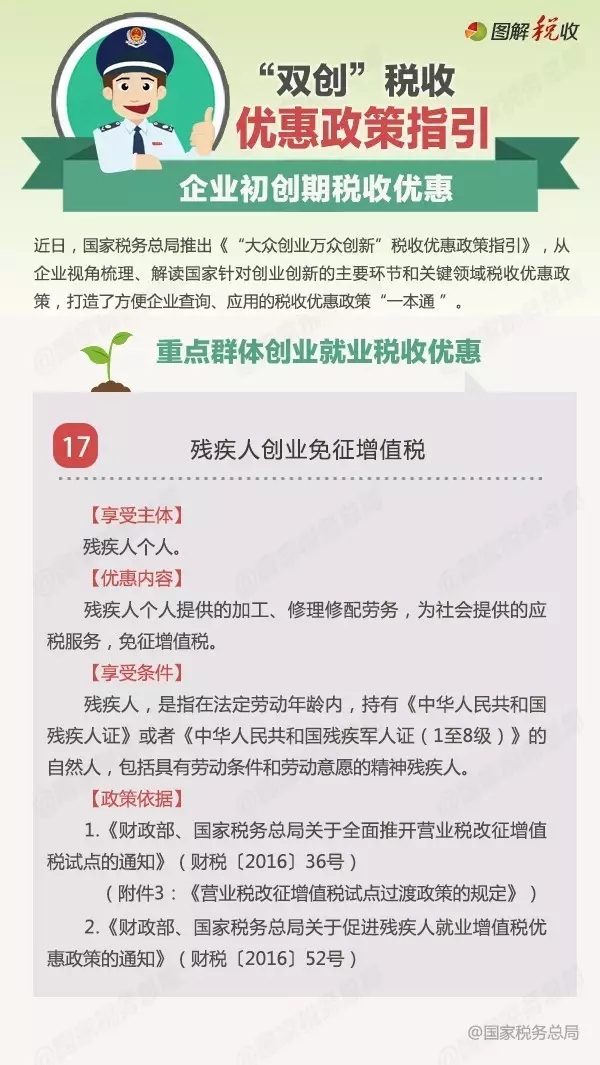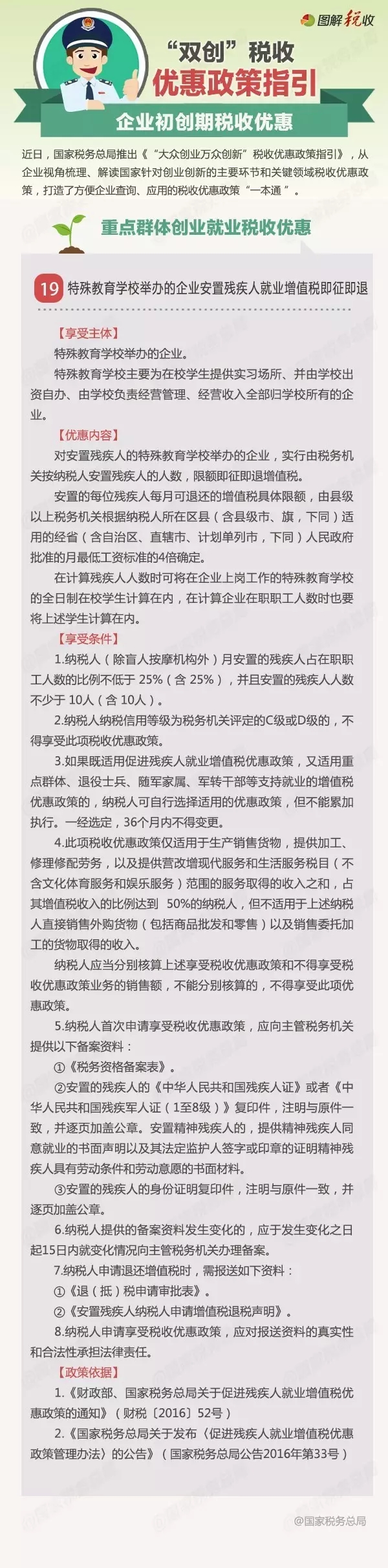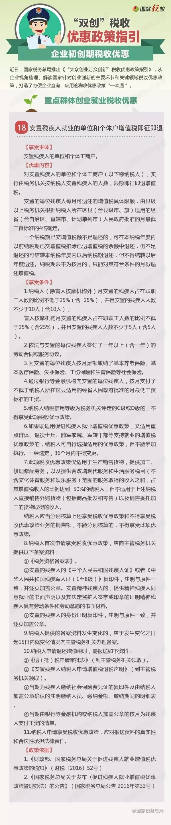 近日,国家税务总局推出《“大众创业万众创新”税收优惠政策指引》,我们将陆续编发税收优惠政策的具体内容。今日发布残疾人创业就业相关税收优惠政策,包括残疾人创业免征增值税、安置残疾人就业的单位和个体户增值税即征即退政策、特殊教育学校举办的企业安置残疾人就业增值税即征即退、残疾人就业减征个人所得税、安置残疾人就业的企业残疾人工资加计扣除、安置残疾人就业的单位减免城镇土地使用税。
