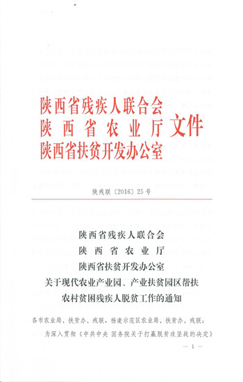 为深入贯彻《中共中央 国务院关于打赢脱贫攻坚战的决定》和《中共陕西省委 陕西省人民政府关于贯彻落实〈中共中央国务院关于打赢脱贫攻坚战的决定〉的实施意见》精神,落实中央扶贫开发和省脱贫攻坚工作会议精神,发挥农业部门现代农业产业园、扶贫部门产业扶贫园区综合优势,通过产业帮扶,加快农村残疾人脱贫步伐,现就现代农业产业园、产业扶贫园区帮扶农村贫困残疾人工作通知如下。