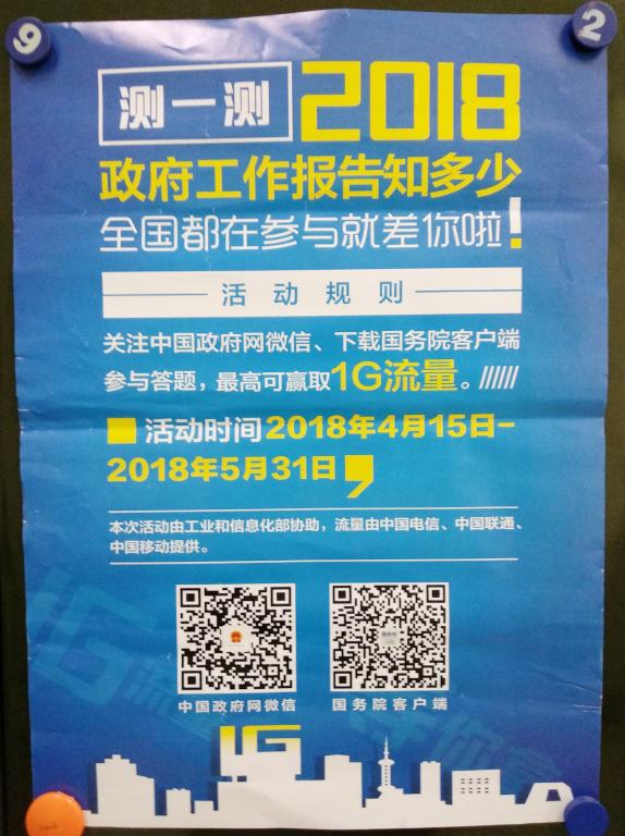 测一测2018政府工作报告知多少,全国都在参与,就差你啦!关注中国政府网微信、下载国务院客户端参与答题,最高可赢取1G流量,大家都来参与哦!