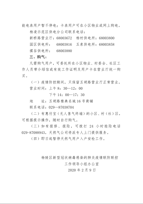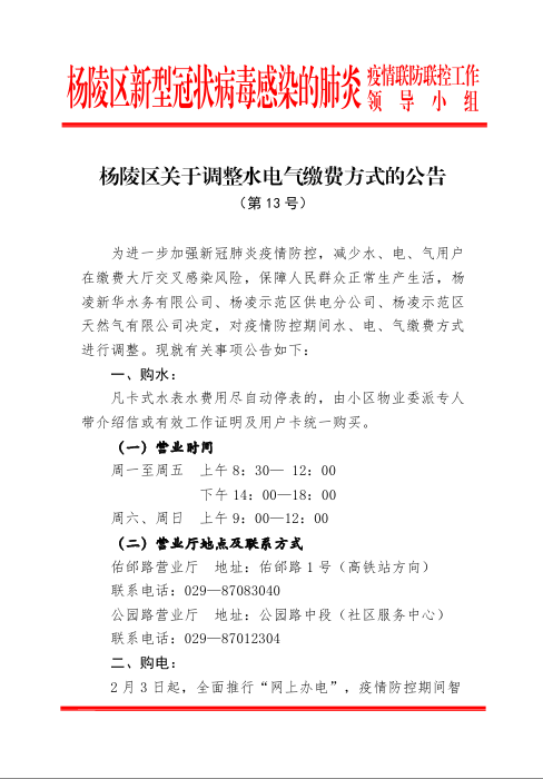 杨陵区关于调整水电气缴费方式的公告(第13号)