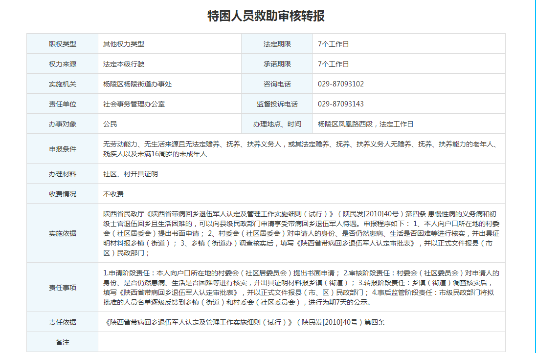 杨陵街道办“其他类”权责清单——特困人员救助审核转报