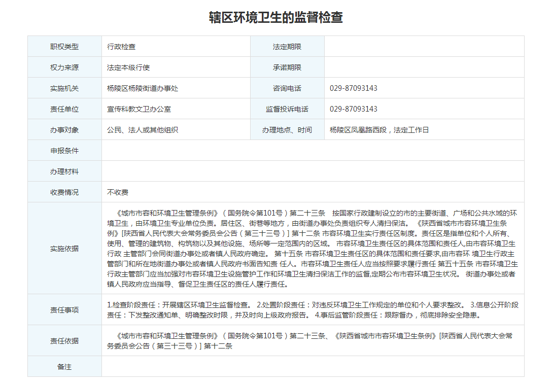 杨陵街道办“行政检查类”权责清单——辖区环境卫生的监督检查