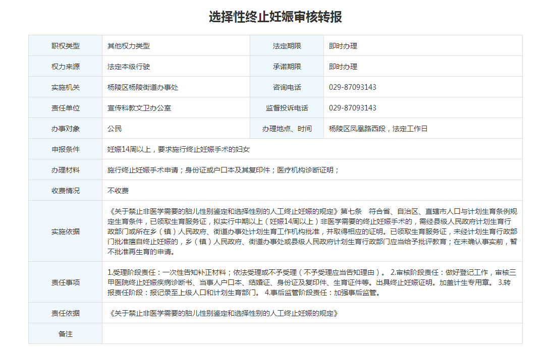 杨陵街道办“其他类”权责清单——选择性终止妊娠审核转报