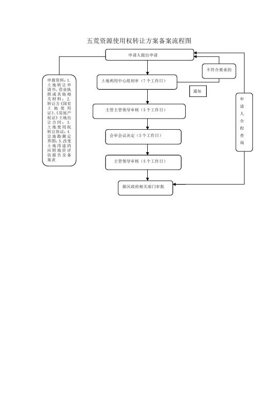 | 办理材料 | 1、书面申请(包括地点、权属、四址边界、主要治理措施); 2、出让方、受让方和监督方签订五荒资源使用权拍卖协议书;转让合同五荒资源现状、使用权转让期限、治理开发的目标、内容、进度、标准、转让金支付方式、违约责任)。 |