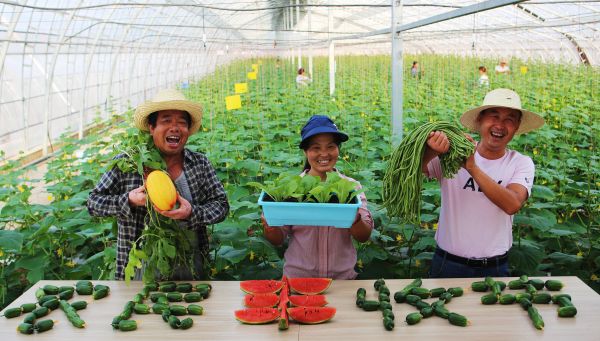 近日,记者来到杨凌现代农业精准扶贫示范园,园内瓜果飘香,丰收在望,小乳瓜、西瓜、豇豆、黄瓜等果蔬采摘在即。为庆祝首届中国农民丰收节的到来,精准扶贫示范园农技人员用果蔬摆出“农民丰收节”字样,表达对首届中国农民丰收节的期盼和丰收的喜悦之情。