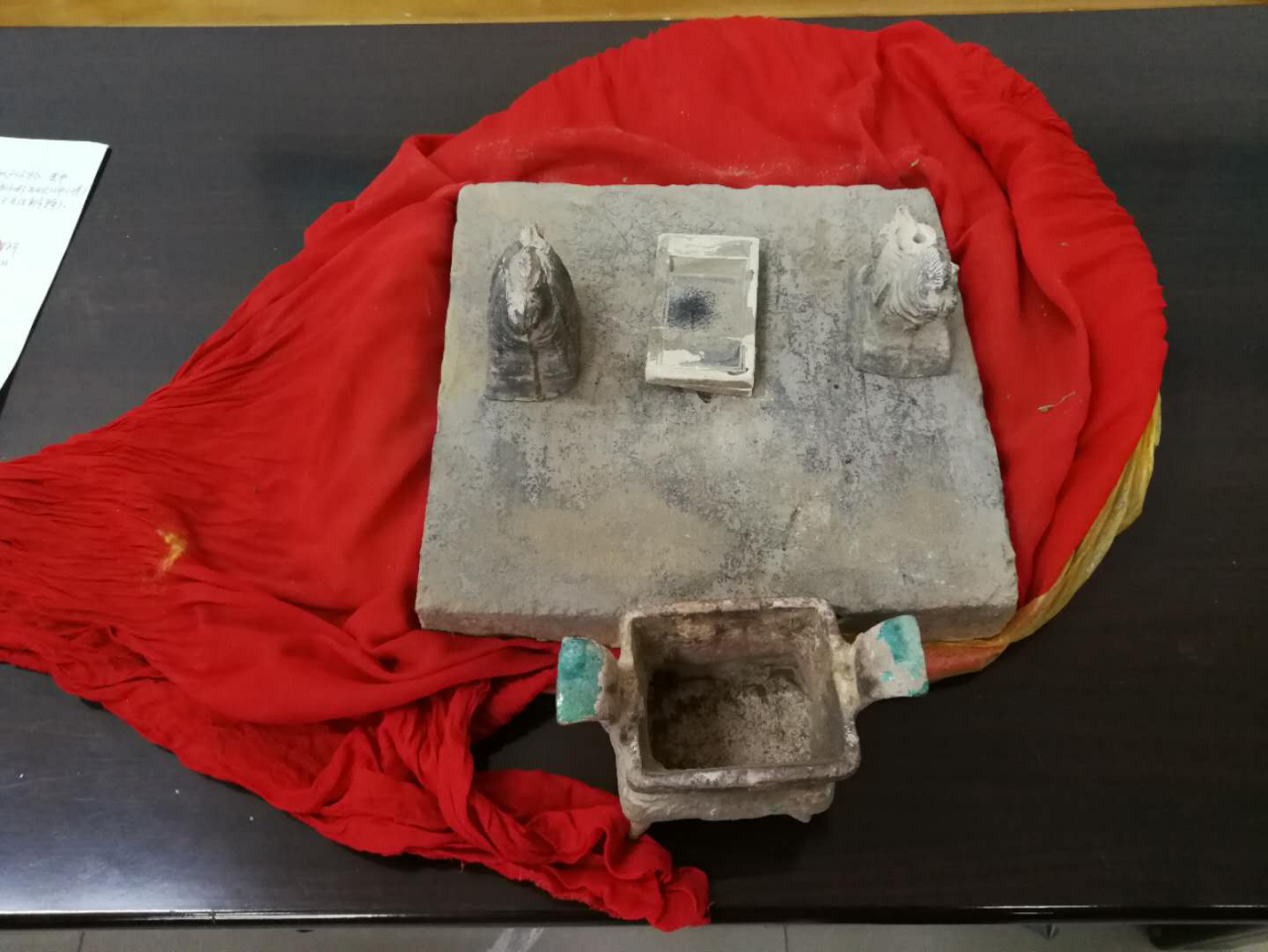 据捐献人穆全社介绍,5件文物中包括高足琉璃香炉1个、马形蜡座2个、方形记事砖1个、长方形石砚台1个,其中方形记事砖上刻有“中分、乾隆十七年十二月二十六日”等字样。本次捐献,得到了上级文物部门领导的高度赞扬。