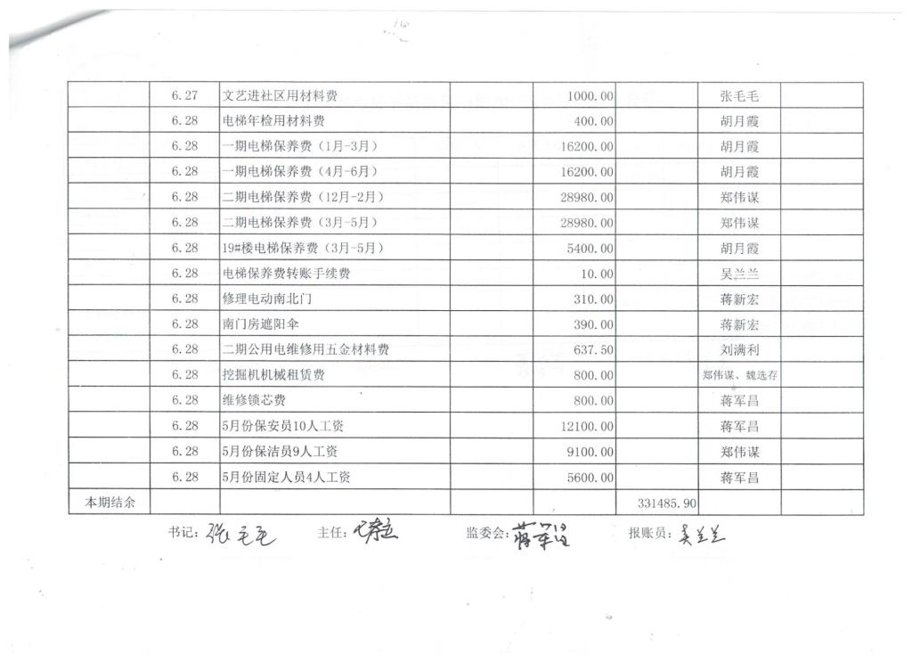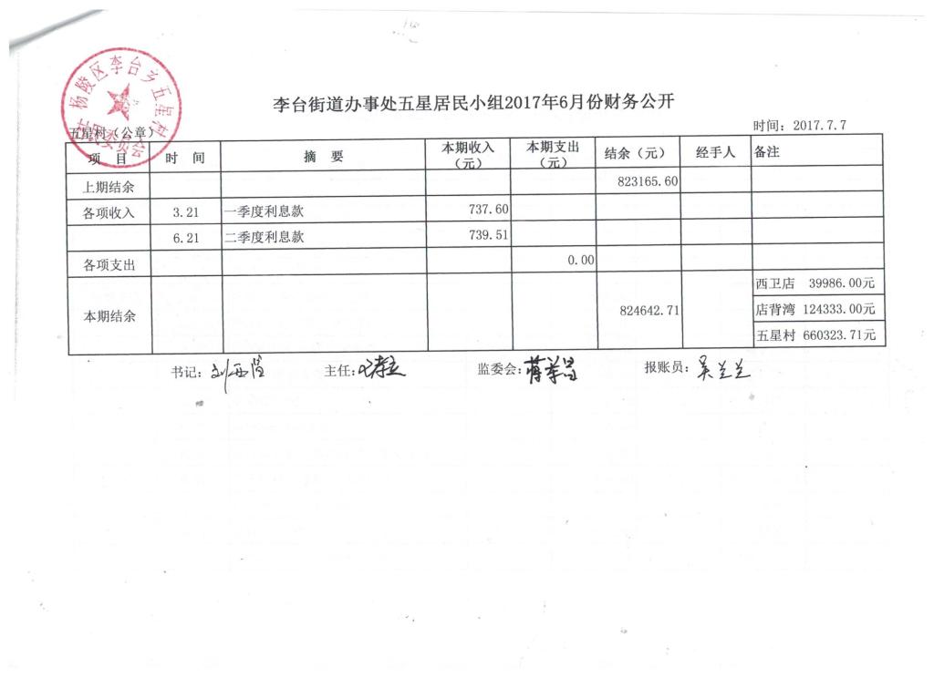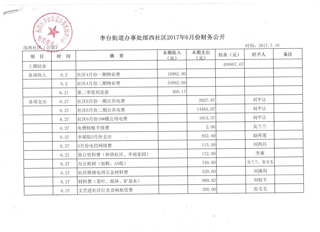 李台街道邰西社区2017年6月份财务公开