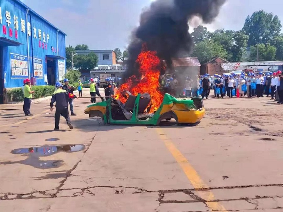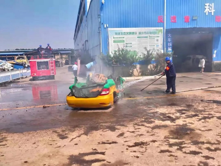 此次消防演练事故模拟陕西金诚报废汽车回收拆解有限公司一辆报废的出租车发生自燃,燃起了熊熊大火,现场十分危急。厂区内负责消防的工作人员迅速组织先行在现场进行灭火处理,随后消防队员赶到现场,扑灭现场明火……