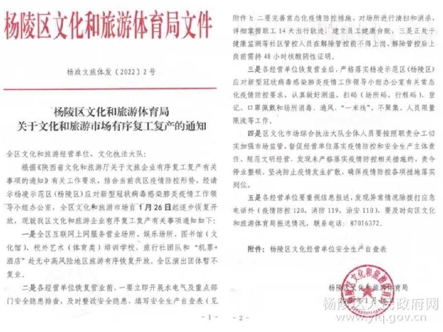为深入贯彻示范区2022年产业发展大会和区委十届二次全会精神,统筹疫情防控和经济社会发展有关要求,杨陵区文旅体育局迅速行动,及时印发了《关于文化和旅游市场有序复工复业的通知》,组织全区各文旅经营单位按照疫情防控常态化要求,有序复工复业。截至2月14日,全区已有40余家文旅经营单位恢复营业。