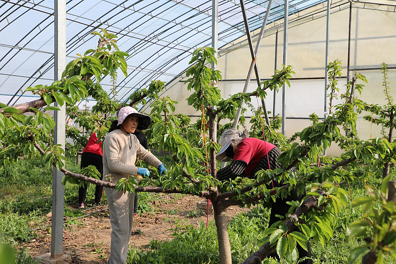 不远处的现代连栋温室大棚内,樱桃花竞相绽放,春意盎然。村民们穿梭其间,小心翼翼地进行人工授粉。“这是我们抢占市场的‘先手棋’。通过设施栽培,樱桃上市时间比露天种植提前了15-20天,价格优势明显。”正在田间指导的杨凌韩娇家庭农场负责人许卫平告诉记者,针对花期温湿度控制、授粉管理等关键环节,团队已建立标准化操作流程,确保坐果率与果实品质。