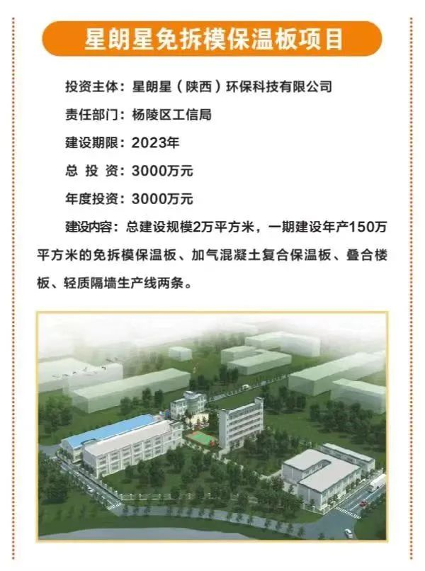 12.星朗星免拆模保温板项目,总投资3000万元,由星朗星(陕西)环保科技有限公司投资,主要建设年产150万平方米的免拆模保温板、加气混凝土复合保温板、叠合楼板、轻质隔墙生产线两条。