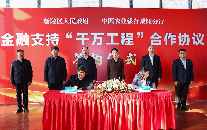1月7日,杨陵区人民政府与农行咸阳分行签署金融支持“千万工程”合作协议。区长李朝喜和农行咸阳分行党委书记、行长王楠出席签约仪式并致辞。