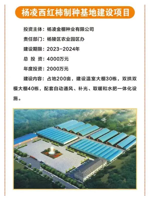 4.杨凌西红柿制种基地建设项目,占地200亩,总投资4000万元,由杨凌金棚种业有限公司投资,主要建设温室大棚30栋,双拱双模大棚40栋,配套自动通风、补光、取暖和水肥一体化设施。