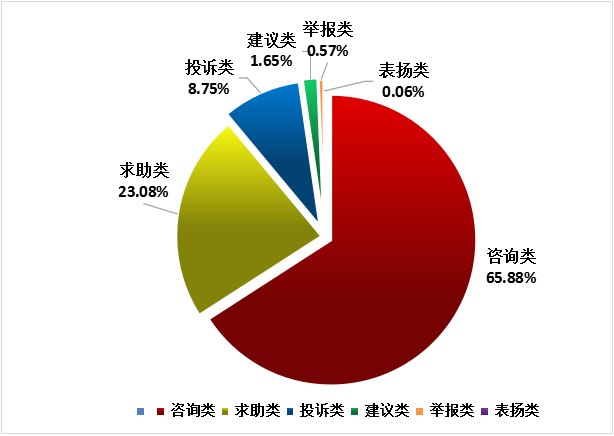按诉求类别统计:咨询类共1039件,占比65.88%,主要涉及各部门相关信息,居民生活类、农科城卡相关事宜及热线工单业务办理咨询等。求助类共364件,占比23.08%,主要涉及工地施工、水、电、燃气、光和噪音污染、电梯求助等问题。投诉类共138件,占比8.75%,主要涉及市容环卫、工地施工、小区物业管理、部门工作人员服务态度等问题。建议类共26件,占比1.65%,涉及城市公共设施、市政设施、道路交通等问题。举报类共9件,占比0.57%,涉及市场监管、城市管理及红绿灯相关等问题。表扬类共1件,占比0.06%,涉及对相关部门优秀工作人员的赞扬。