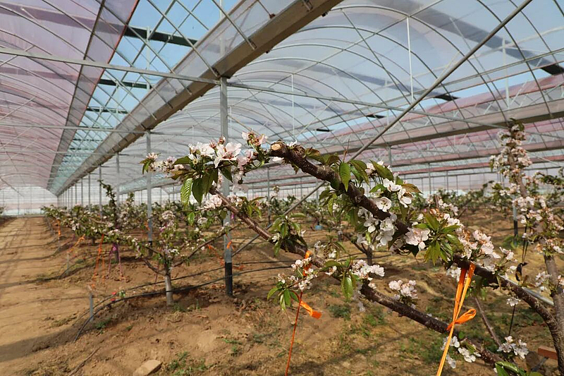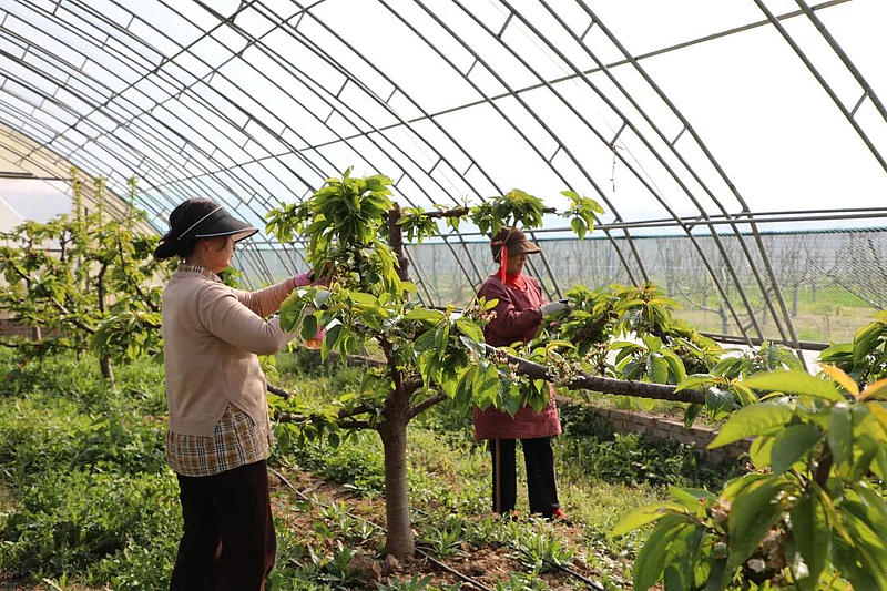 “我们现在建成了两座连栋大棚,今年第一批樱桃预计能产4000到5000斤,眼下正是授粉关键期,每天都要雇10位左右村民来帮忙。”农场负责人许卫平介绍。得益于先进的设施栽培技术,这里的樱桃上市时间比露天种植足足提前了15-20天,抢先占据市场先机,也让樱桃的经济效益大幅提升。