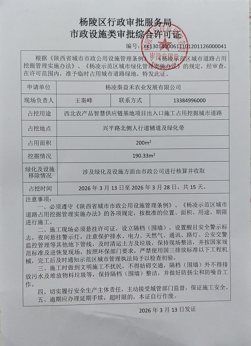 占用挖掘城市道路审批公示(西北农产品智慧供应链基地项目出入口施工)