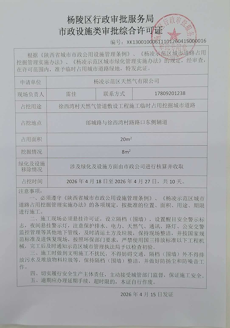 占用挖掘城市道路审批公示(徐西湾村天然气管道敷设工程施工临时占挖用城市道路)