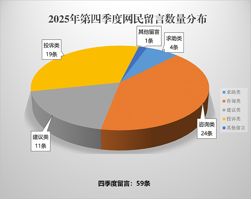 咨询类共24条,占比40.68%;求助类共4条,占比6.78%;投诉类共19条,占比32.20%;建议类共11条,占比18.64%,其他类共1条,占比1.69%。