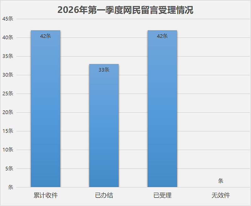 2026年第一季度,杨陵区人民政府网站共计受理网民留言42条,环比减少36.36%,其中:有效留言42条,环比减少36.36%;无效留言0条;已办结33条,转下季度办理9条,办结率78.57%。
