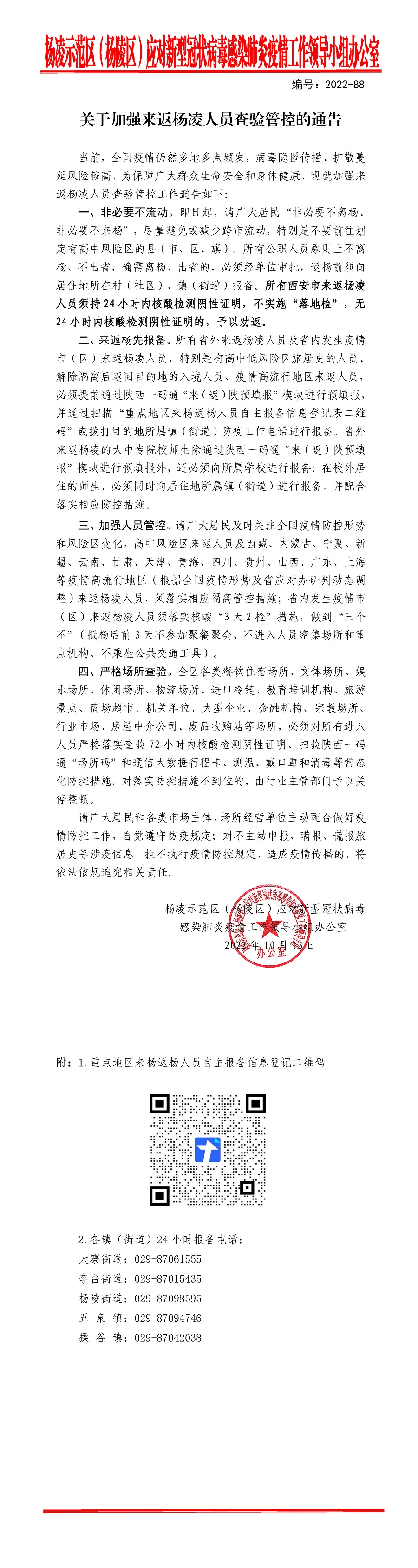 关于加强来返杨凌人员查验管控的通告(2022-88)