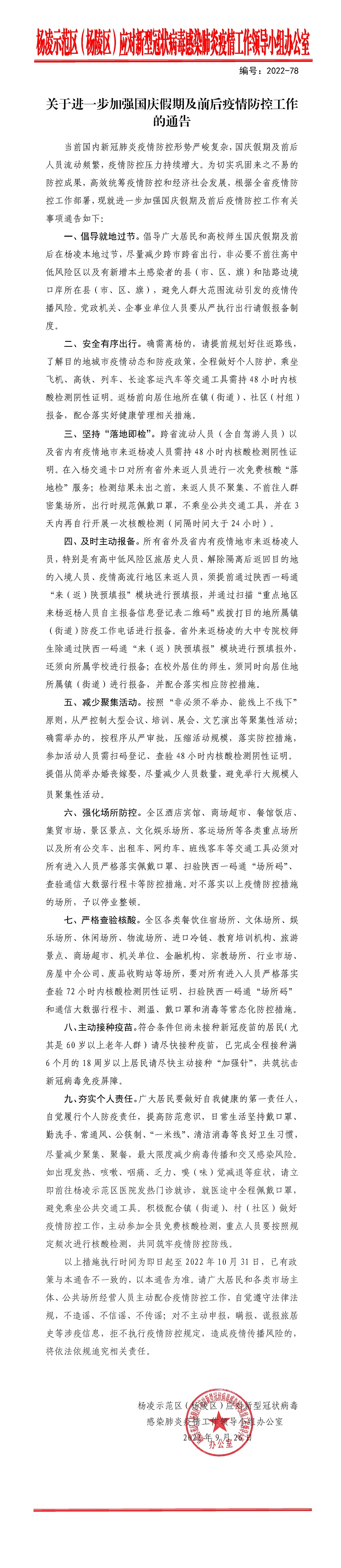 关于进一步加强国庆假期及前后疫情防控工作的通告(2022-78)