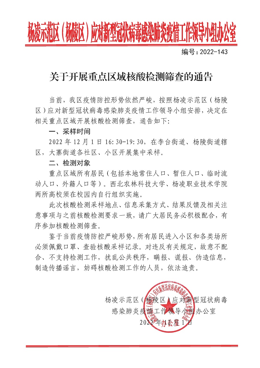 关于开展重点区域核酸检测筛查的通告(2022-143)